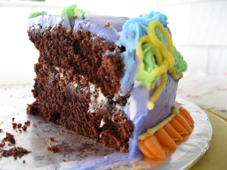 There were a handful of debacles (including me spraying frosting all over the kitchen when it overflowed out of the spinning mixer), but you know, you live and learn! The cake recipe came off the Hershey’s Cocoa Powder container, and the decorating came out of the book The Whimsical BakeHouse by Kaye & Liv Hansen.