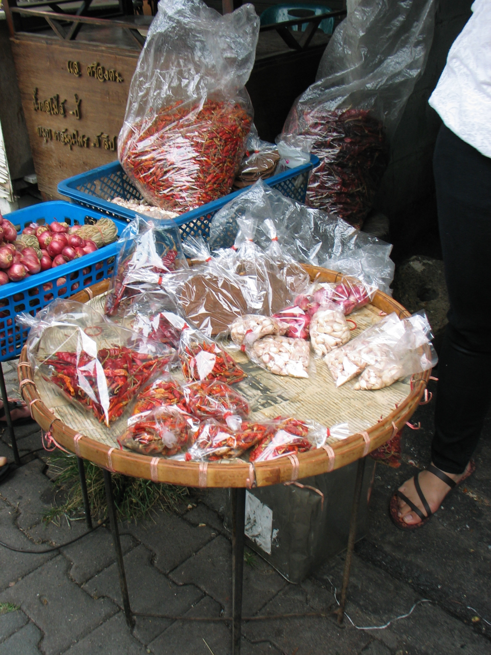 Our instructor, Palm, picked us up at your guesthouse first thing in the morning and we drove to the school for some green tea. We then met up with the rest of the students (there were seven of us in total) and walked to the local market. It was great to go with a Thai woman because the markets can be very confusing to us farangs (foreigners). It was exactly what you expect: an indoor/outdoor market with lots of stalls selling all sorts of veggies and meats that we’ve never seen before. Palm was great and she explained what everything was and how to pick the best rice and produce.