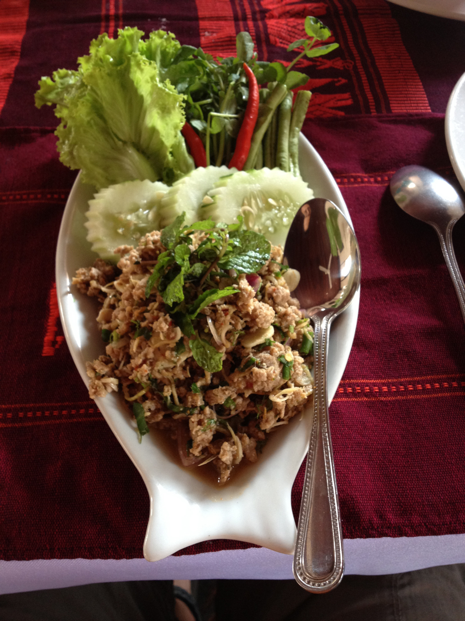 We went to a cooking class which was held outside the city in a gorgeous little valley with thatched huts overlooking a river. We cooked on earthenware ovens and ground all our ingredients and herbs in a stone mortar and pestle. Lao cuisine has borrowed a bit too much from the French, in my opinion, because it is extremely complicated to cook. Though I’ve still decided to try making mak pla when I get home.