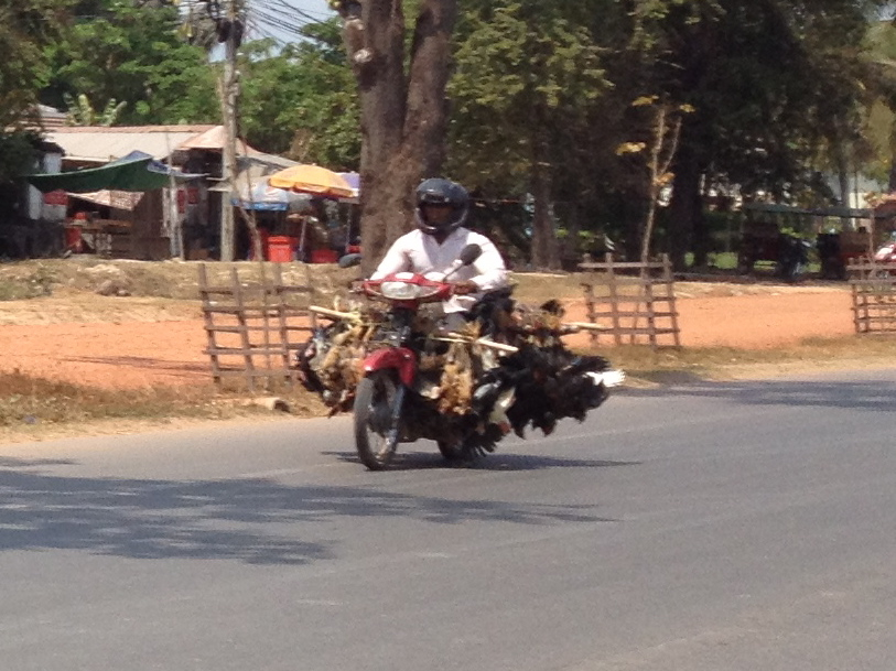 This guy is driving down the road with dead, feathered chickens hanging off his bike