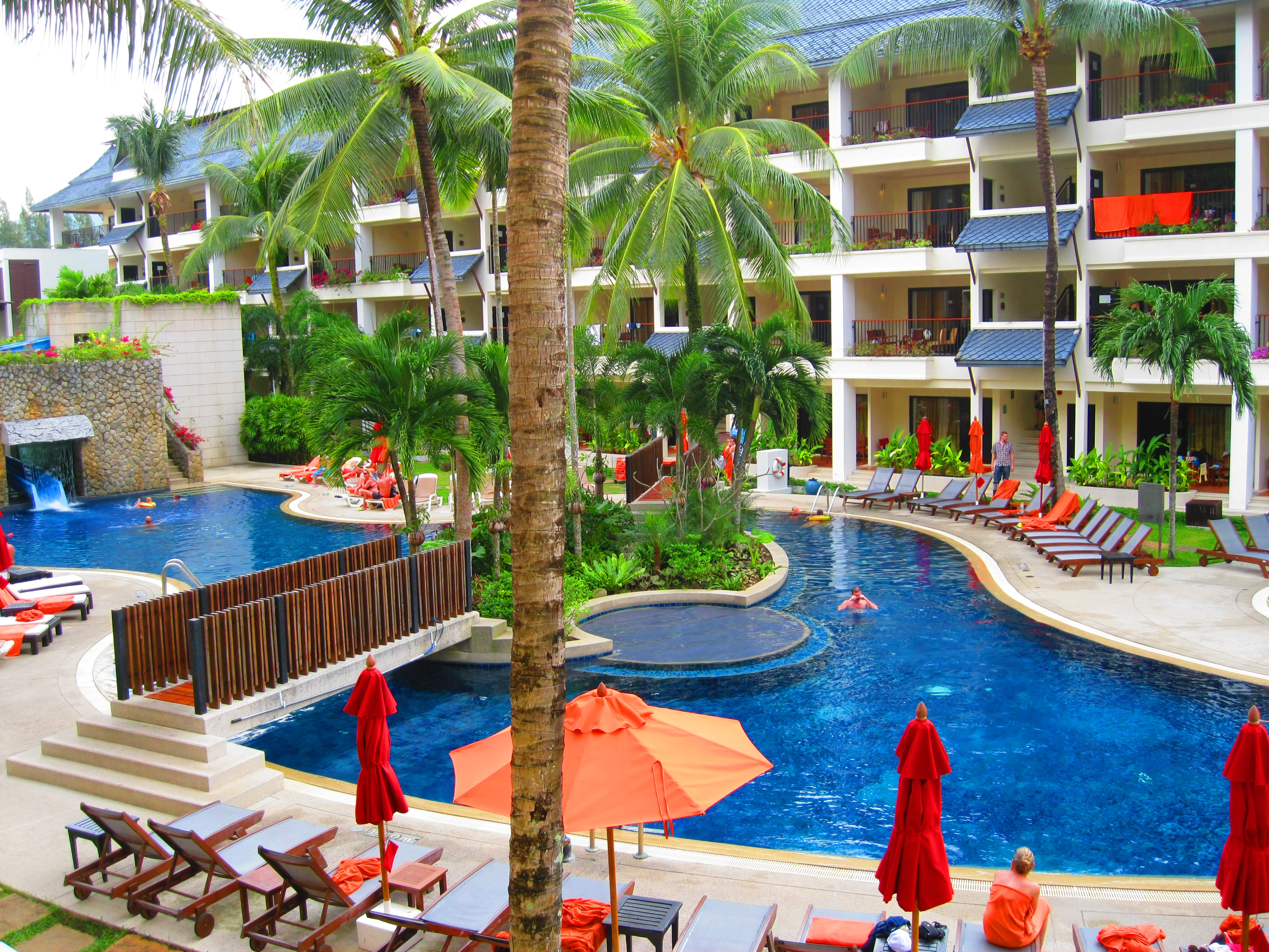 The Marriott Phuket was the fanciest hotel either of us have ever stayed in, ever. It had a separate living room from the bathroom, 2 tvs, a stand up shower, a stocked mini-bar, free fresh fruit, a bed with a top sheet, comfortable pillows, free beach towels, and quite the pool set up! We felt like high rollers, and out of place in our smelly clothes and dirty backpacks 🙂