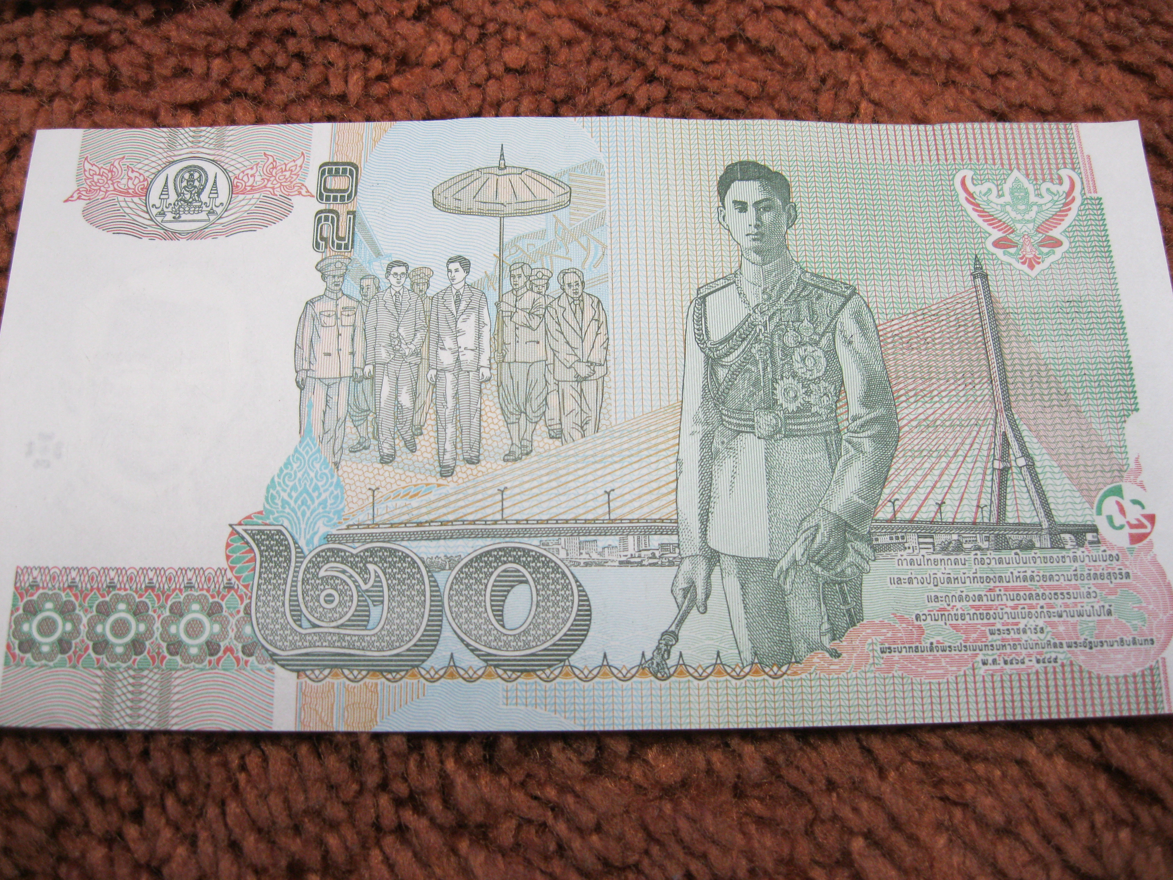 Description: Paper bill, green, with picture of King Bhumibol Adulyadej (also called King Rama IX), the longest serving monarch in the world (65 years). Reverse side: more pictures of king, bridge in Bangkok.