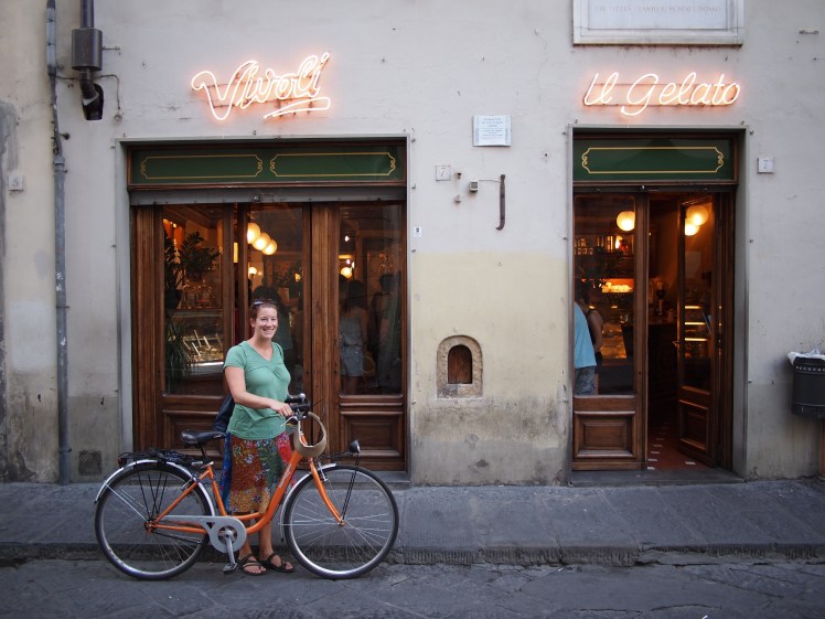 We used our bikes to explore Florence – searching out quiet shade and nice overlooks. We spent a good amount of time hunting for a high-rated Gelataria named Il Procopio (my sister’s last name) but couldn’t find it – it was most likely chiuso per ferio – closed for vacation, like many of the businesses in Italy for the month of August. We instead got gelato at this place: