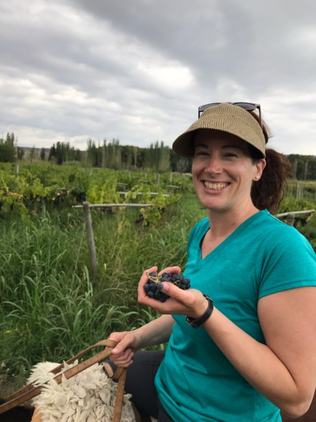 The vines were so loaded with grapes that you could reach out and grab a bunch. Here Jenny demonstrates the correct way to eat grapes while riding a horse: you hold them in one hand and then stuff them in your mouth!