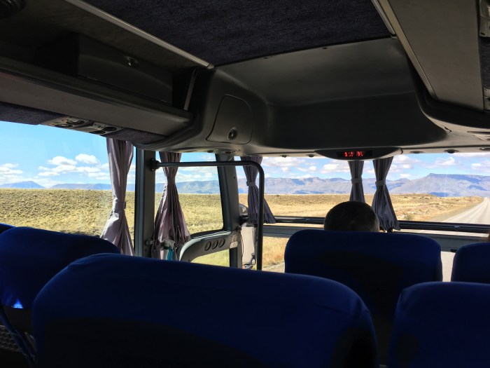 From the bus, you could see forever across a seeming sort of a wasteland of dry scrub; but there are a few huge (like so big you can’t see across them) turquoise lakes and imposing distant mountain peaks. On top of that, you get animals like guanacos (a cousin of the llama) and rheas (cousin of the emu/ostrich). Mixed in are some sheep, horses, and cows. While I wanted to sleep on the bus ride, I couldn’t because I was so mesmerized by the scenery.