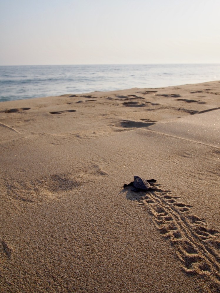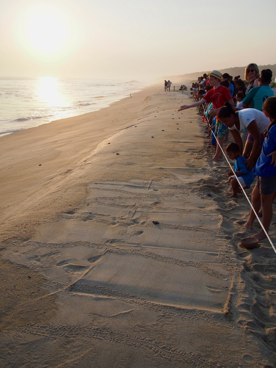Every morning and night, volunteers patrol the beaches looking for sea turtles that have laid their eggs. When they find a nest of eggs, they move them to a protected corral on the beach where they’ll be safe from wild animals and poachers. For the next several months, the volunteers guard the eggs and when they are ready to hatch they invite locals and tourists to be part of the baby turtles’ first steps and help them on their journey to the ocean.